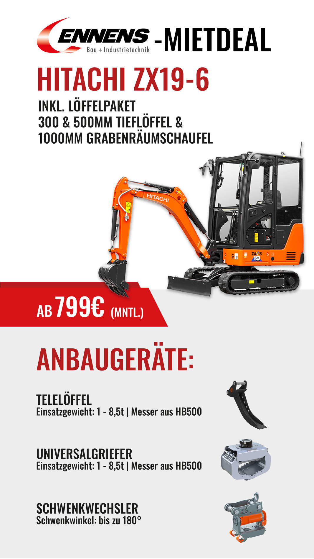 Hitachi Z19-6 oder Volvo EC18E inkl. Löffelpaket und Anhänger für nur 899,00€ netto im Monat.
